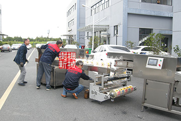 2017年10月20日,我公司生产的一套河粉包装设备终于顺利装车发货了。本套设备在SMZH-950枕式包装机的基础上定制了一套自动进料装置,实现了河粉自动下料,自动检测,重量测量,自动切包等。