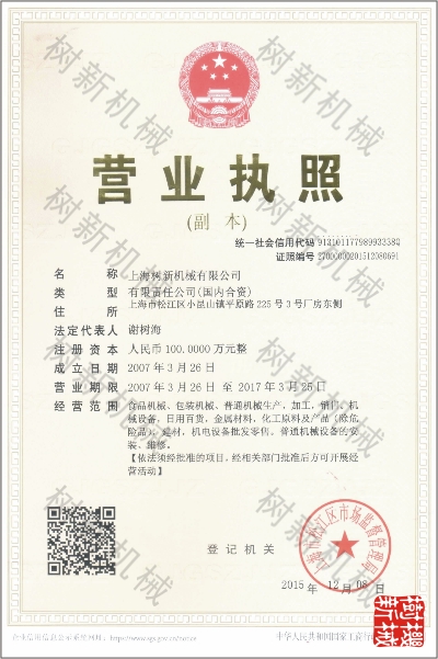 上海树新机械有限公司于2007年正式于工商管理局注册成立,并获批一般纳税人资格, 2010年也顺利注册了商标:树新机械.相关资质证件如下...